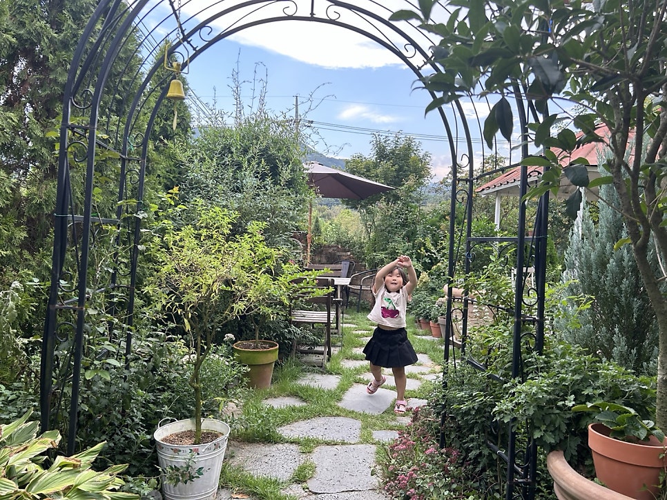 아이도 잔디밭을 신나게 뛰어다니고, 엄마는 그 모습 보며 커피 한 모금… 이게 힐링이죠💚